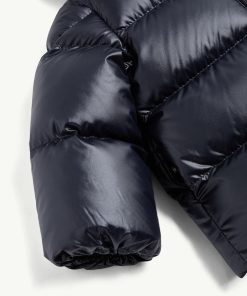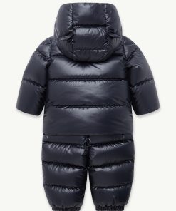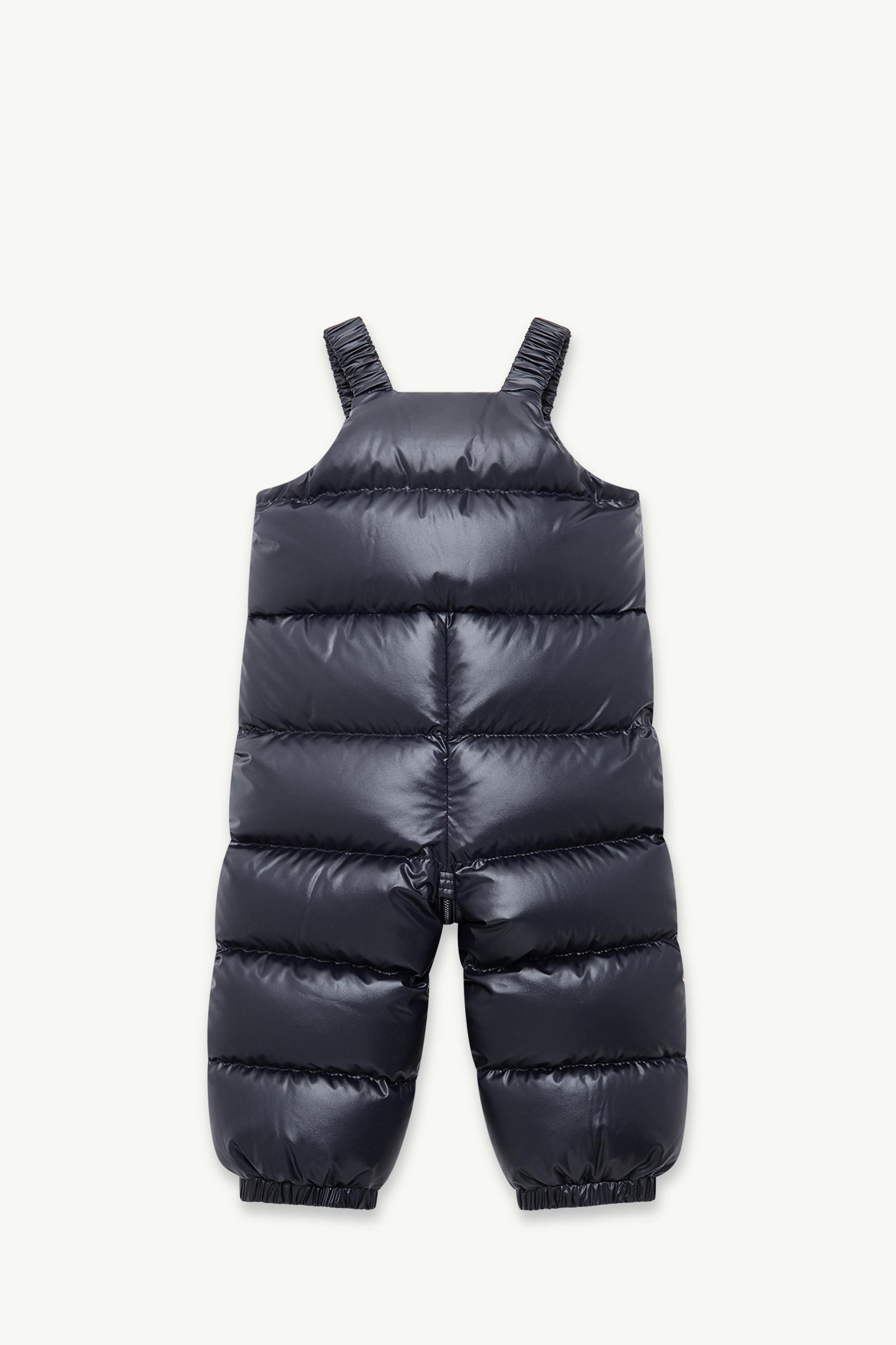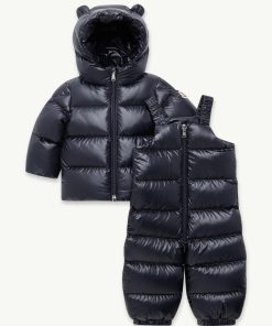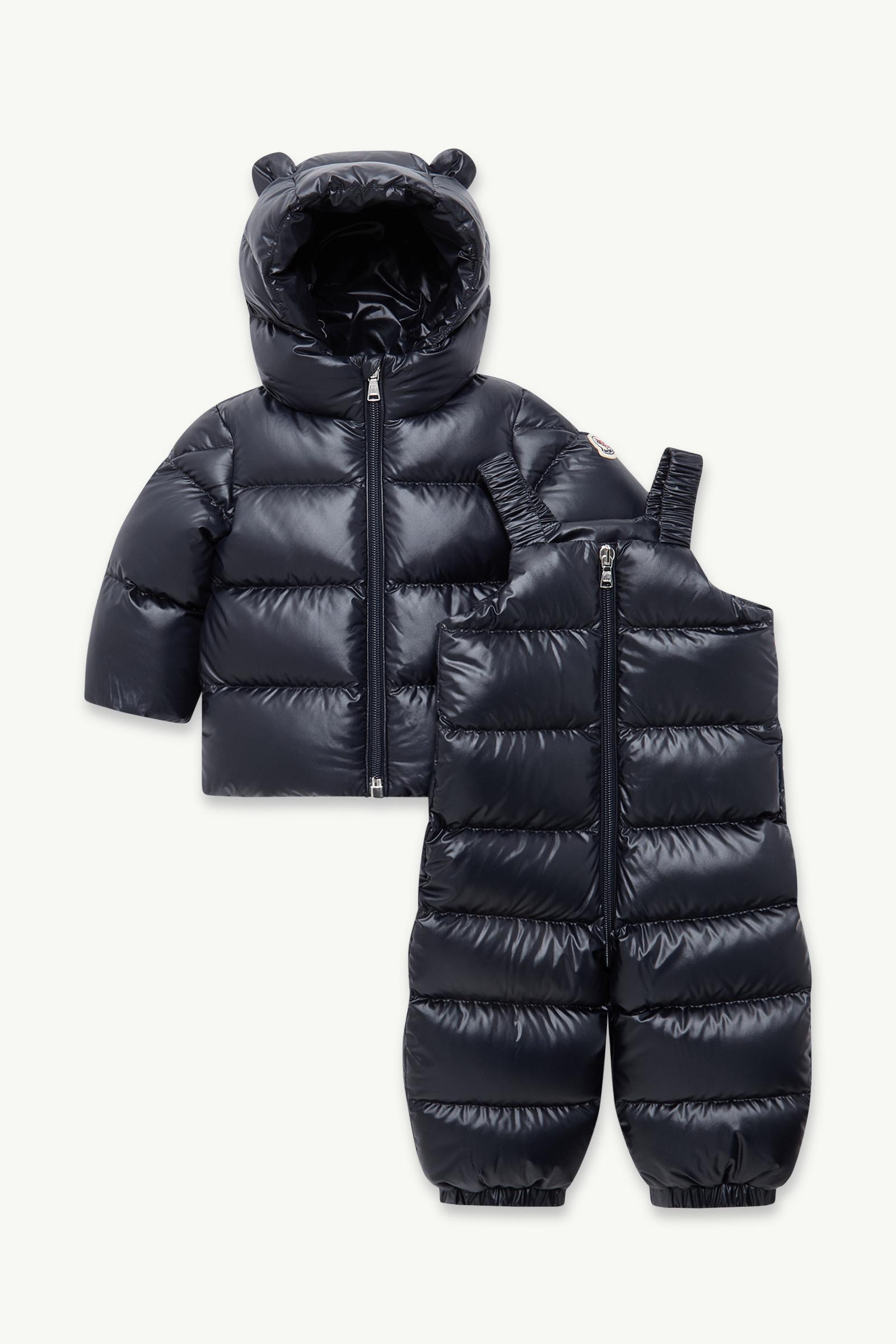 From cold-weather first outings to snowy days, this set is designed for ultimate warmth. The two-piece ensemble features down-filled overalls and a hooded jacket. Crafted from recycled polyester, the set boasts a shiny finish while teddy-inspired ears on the hood add the final touch.