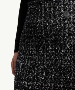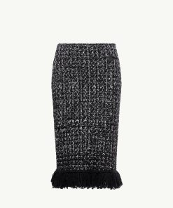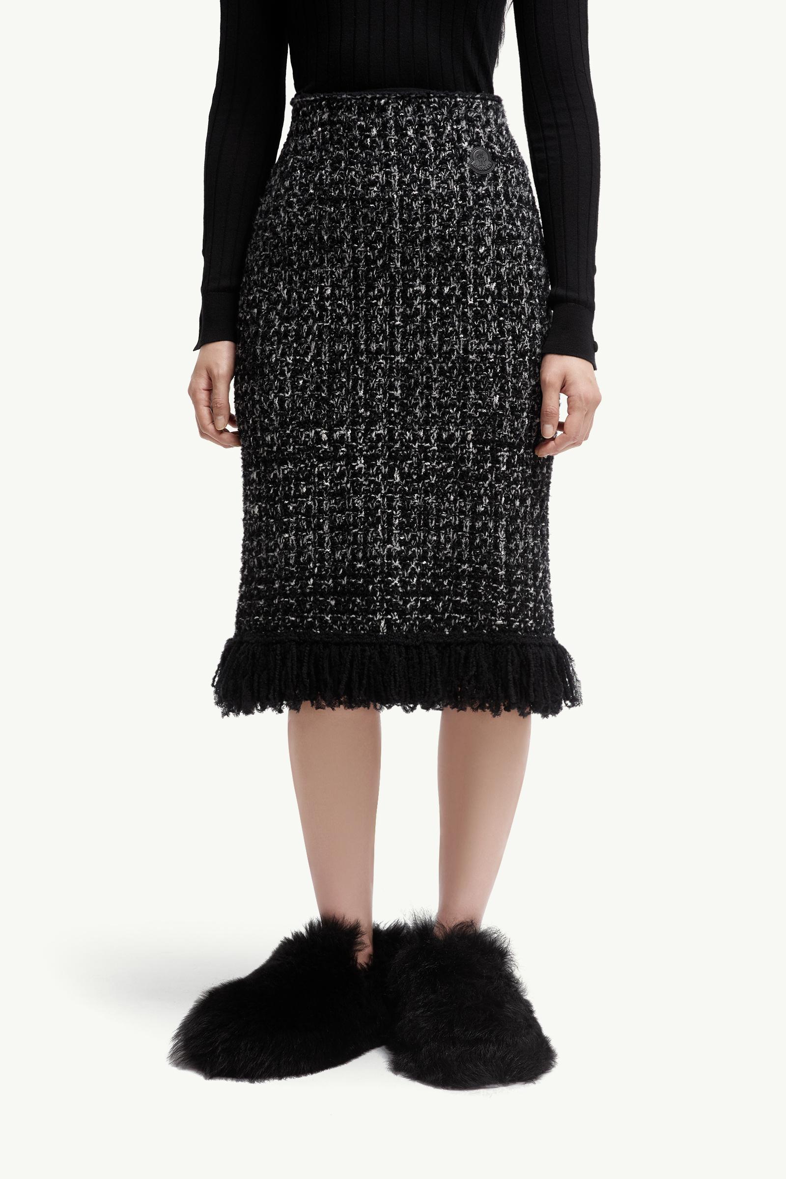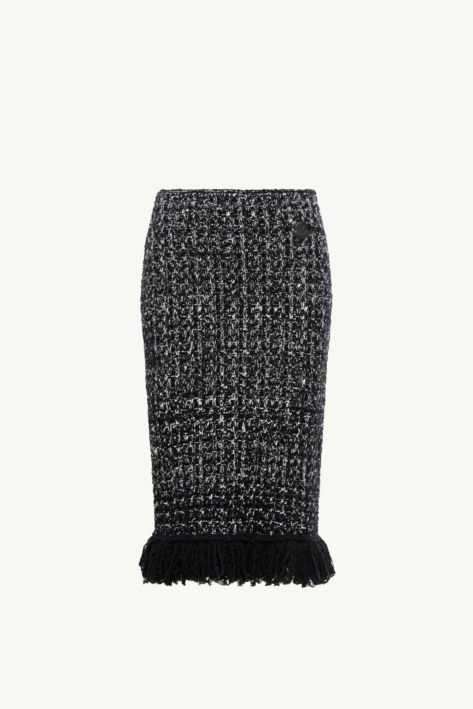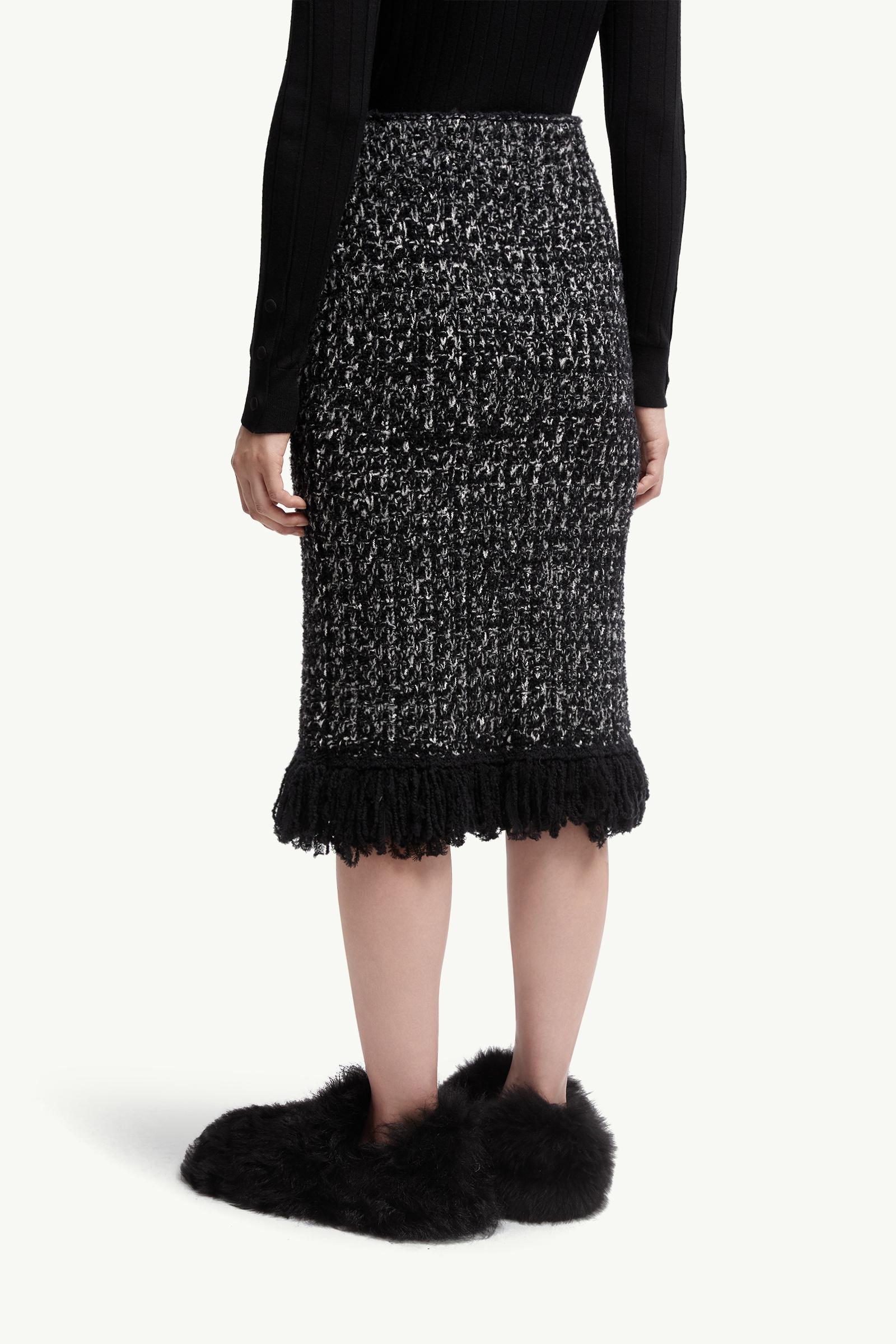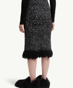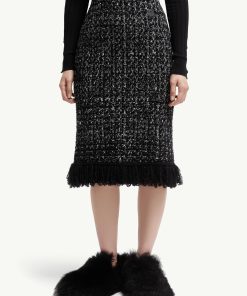 A study in sophisticated textures, this skirt pairs mouliné wool with fringed accents. The heavy knit pairs effortlessly with a matching sweater, encapsulating cold weather elegance.
