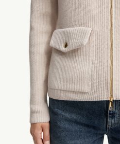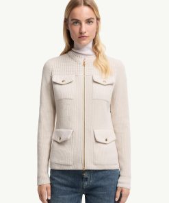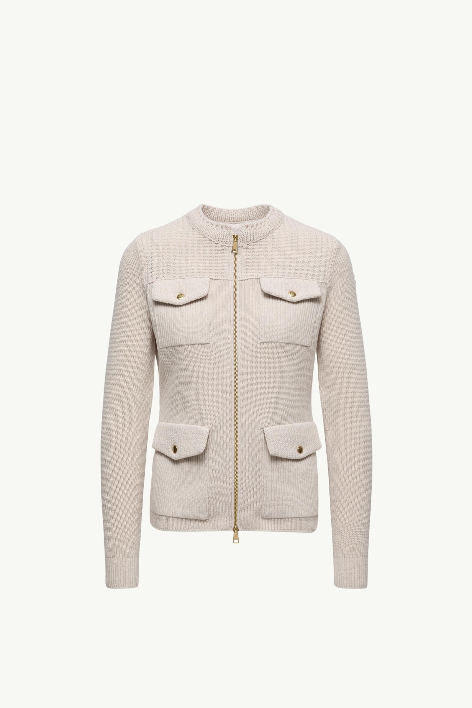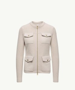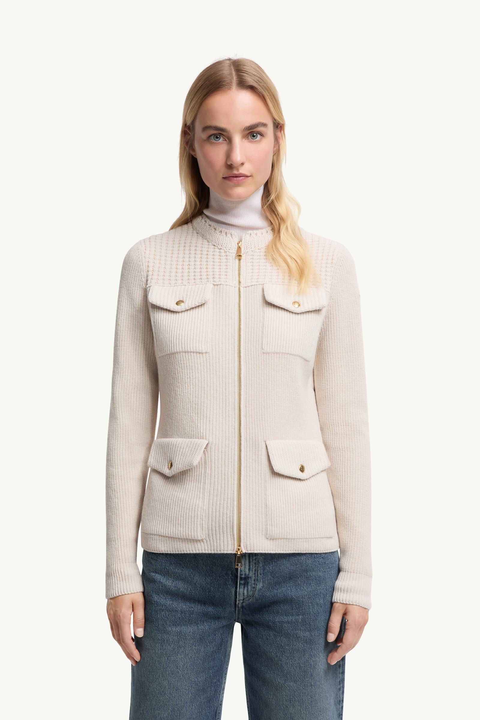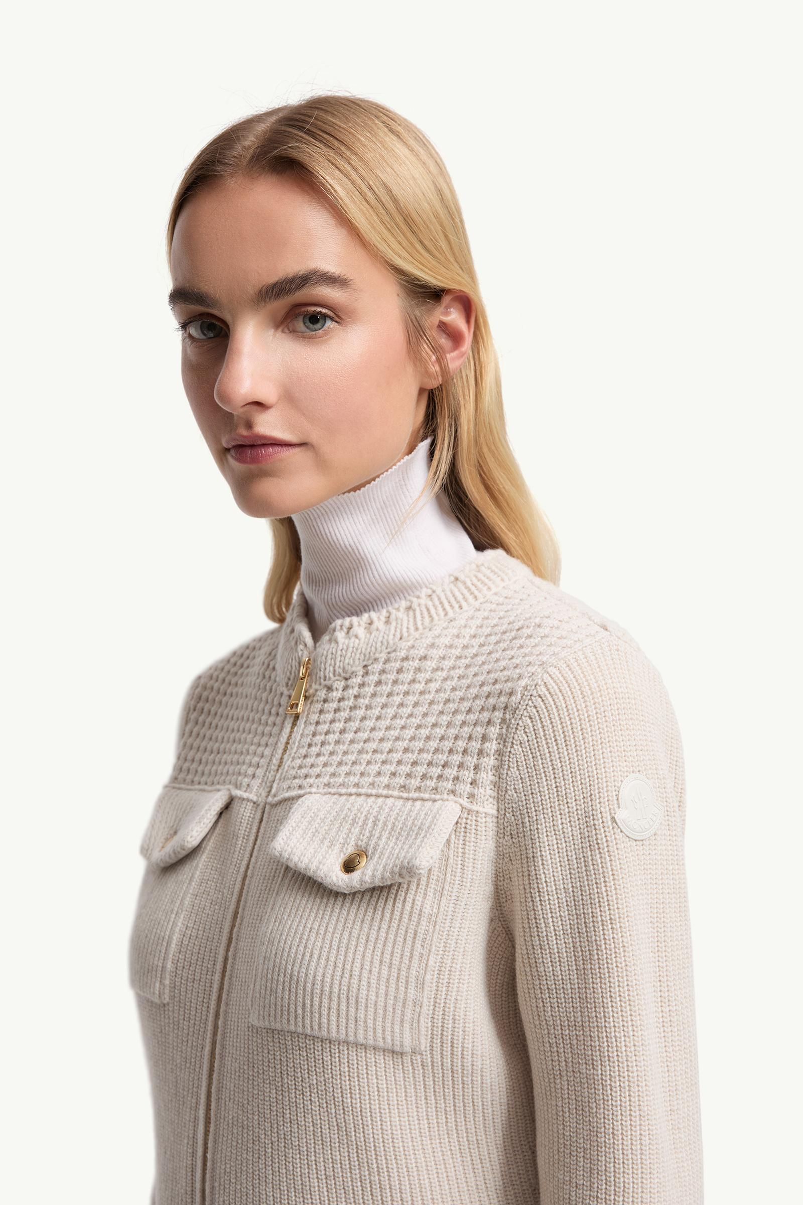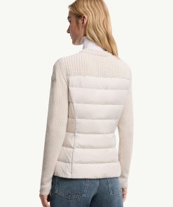 An elegant addition to a year-round wardrobe, this cardigan mixes different knit textures for a graphic effect. The mid-weight design is equipped with a warm down-filled back, allowing it to double as outerwear in milder weather. Creating a feminine silhouette, a belt completes the piece.