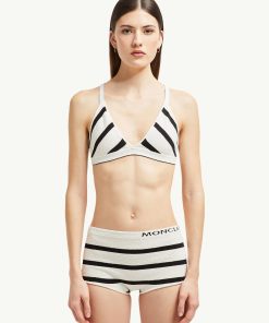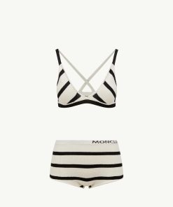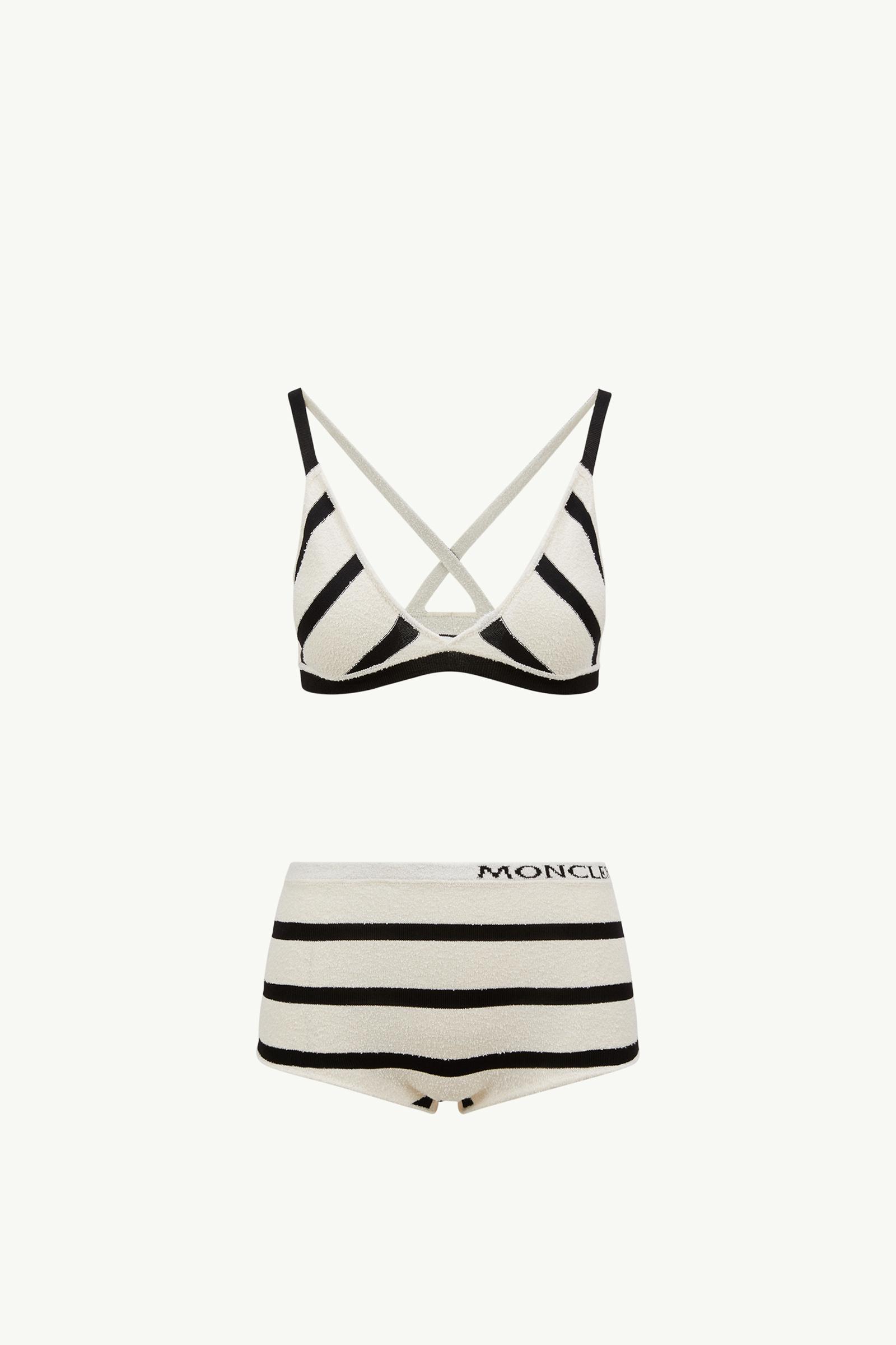 Reminiscent of vintage sailor imagery, horizontal stripes characterize this bikini. The two-piece set is crafted from textured bouclé fabric, adding a sophisticated feel.